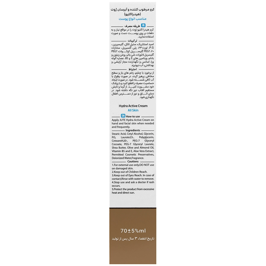 این کرم حاوی ویتامین های E و B5 است که به عنوان آنتی اکسیدان عمل کرده و علاوه بر محافظت از پوست در برابر اثرات اکسیداتیو رادیکال های آزاد، در نرمی و حفظ رطوبت پوست نیز اثرگذار هستند. آلوئه ورای موجود در کرم مرطوب کننده هیدرا اکتیو تیوپی 70 میل ژوت، از التهاب و قرمزی پوست خشک کاسته و به آبرسانی آن کمک می کند. شی باتر موجود در این آبرسان نیز، رطوبت پوست را به دام انداخته و تحریکات ناشی از عوامل محیطی و اگزما را کاهش می دهد.