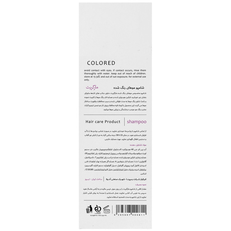ویژگی: حاوی جاذب های اشعه ماورا بنفش، افزایش دوام رنگ مو، محافظت و تقویت از ساختار مو، افزایش درخشندگی و زیبایی مو، فاقد سولفات، بدون تست حیوانی
