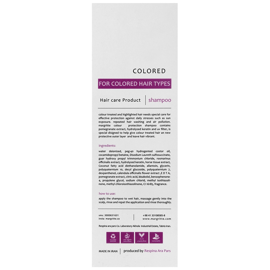 ویژگی: حاوی جاذب های اشعه ماورا بنفش، افزایش دوام رنگ مو، محافظت و تقویت از ساختار مو، افزایش درخشندگی و زیبایی مو، فاقد سولفات، بدون تست حیوانی