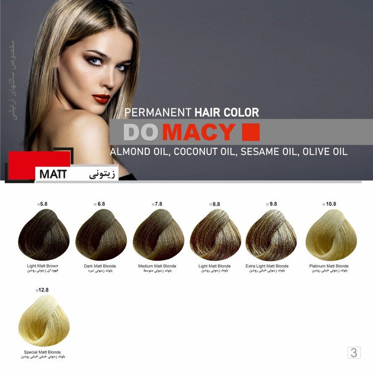 رنگ مو دوماسی با فرمولاسیون فرانسوی دارای قدرت پوشش دهی و پایداری فوق العاده بوده و به دلیل آمونیاک کم مانع از خشکی و آسیب به مو می شود.